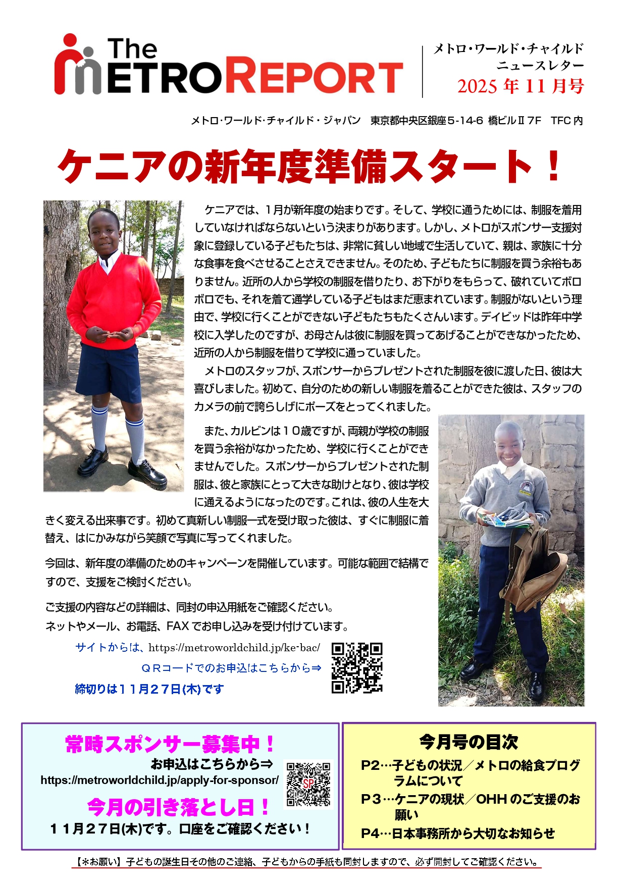 2025年11月14日 / 最終更新日時 : 2025年11月14日 metrojm メトロレポート メトロレポート2025年11月号 メトロレポート2025年11月号は メトロの給食プログラムについて ケニアの現状/ OHHのご支援のお願い 日本事務所からの重要なお知らせ などの記事を掲載しております。ぜひご一読下さい。 ↓クリックするとPDFファイルが開きます。メトロレポート2025年11月号